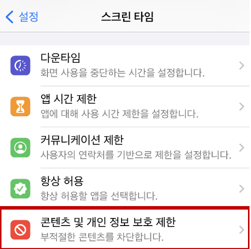 3. 스크린타임에서 콘테츠 및 개인정보 보호 제한을 터치!!(빨같테두리로 표시했어요)