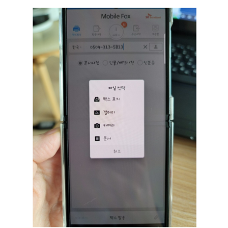 팩스표지를 선택하여 직접 글을 작성 할 수 도 있고 갤러리 중에서 사진을 선택 할수도 있고 카메라로 찍어 서 바로 보낼수 있어요. 문서는 문서 파일을 보내는 거니 참고하시고요.