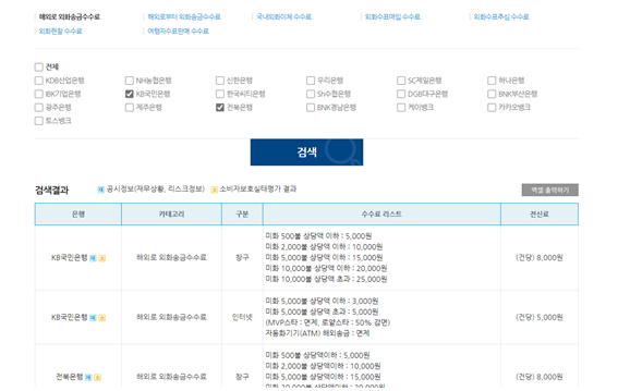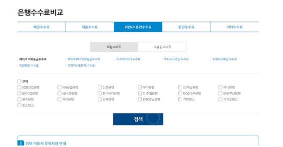 사진 과같은 은행수수료비교 화면으로 가져요 그러면 여기서 바로 원하시는 은행들을 선택 하시고 검색을 누르시면 아래 사진처럼 나와요