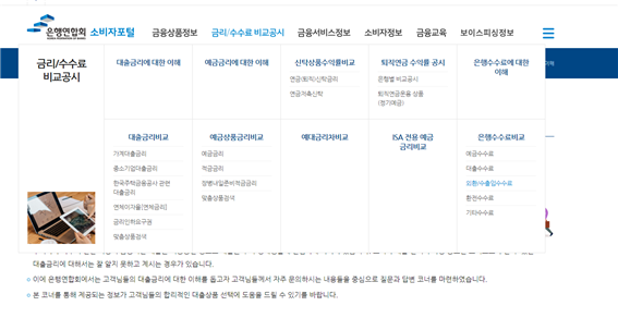 사진을 보시면 금리/수수료비교 공시 -> 외환/수출임수수료를 클릭해주시면(사진의 하늘색)