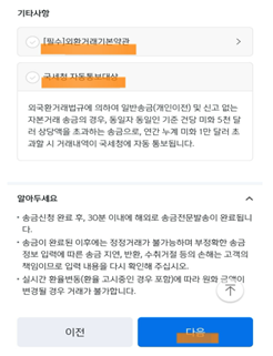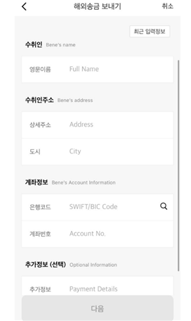 여기서 수취인 정보를 입력 해주시고요. 필수정보 즉 영문이름, 수취인주소 및 계좌번호가 틀리지 않았는지를 여러번 확인해주세요. 오타시 반송이 될 수 있어요.