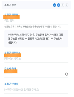 | 위 사진처럼 필요 수취인 정보를 입력 해주시고 오타가 없는지 꼭꼭 확인해주세요. | |