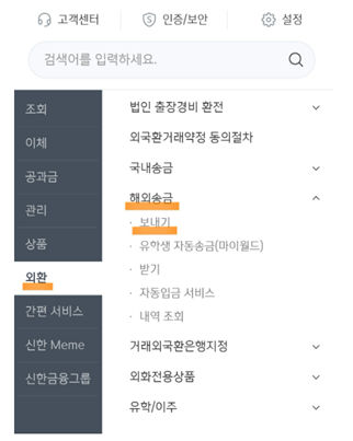 어플의 전체메뉴->외환->해외송금->보내기를 선택 해주세요.