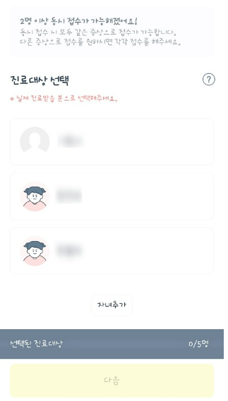 진료대상 선택시 자녀 추가등 가족 전체가 진료 대상으로 선택 가능합니다. 참고하세요.